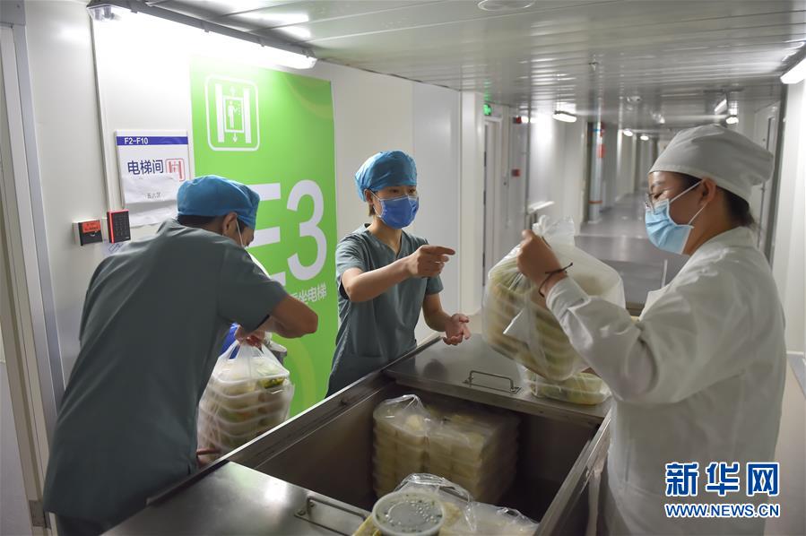 6月19日,在北京地坛医院隔离病区外,护士为病人取餐。新华社记者彭子洋摄