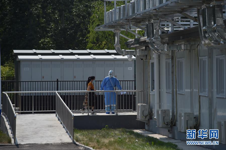 6月19日,在北京地坛医院隔离病区外,一名新收治的病人(左)准备进入隔离病区。新华社记者彭子洋摄