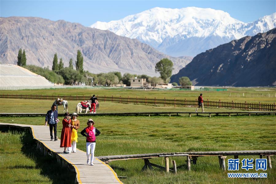 游客在新疆塔什库尔干塔吉克自治县金草滩湿地公园游玩(2019年7月9日摄)。新华社记者李京摄