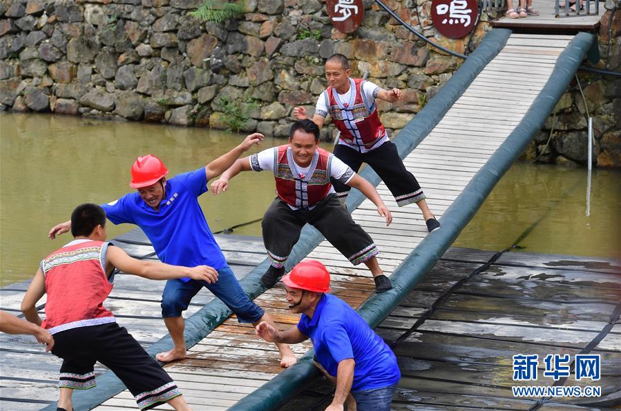 在广西融水双龙沟森林旅游度假区梦呜苗寨,几位搬迁户协助游客挑战“摇摆桥”(6月21日摄)。近年来,融水打造原生态苗族文化体验园——梦呜苗寨,让搬迁进城的贫困户住进复原建设的老房子。景区提供绿化保洁、游乐设施管理、民族歌舞表演等工作岗位,多渠道增加贫困户收入。
