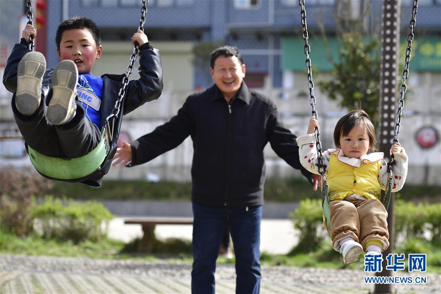 陕西宁强县大安镇江林安置点的居民带着孙子、孙女在安置点广场上荡秋千(3月13日摄)。新华社记者邵瑞摄