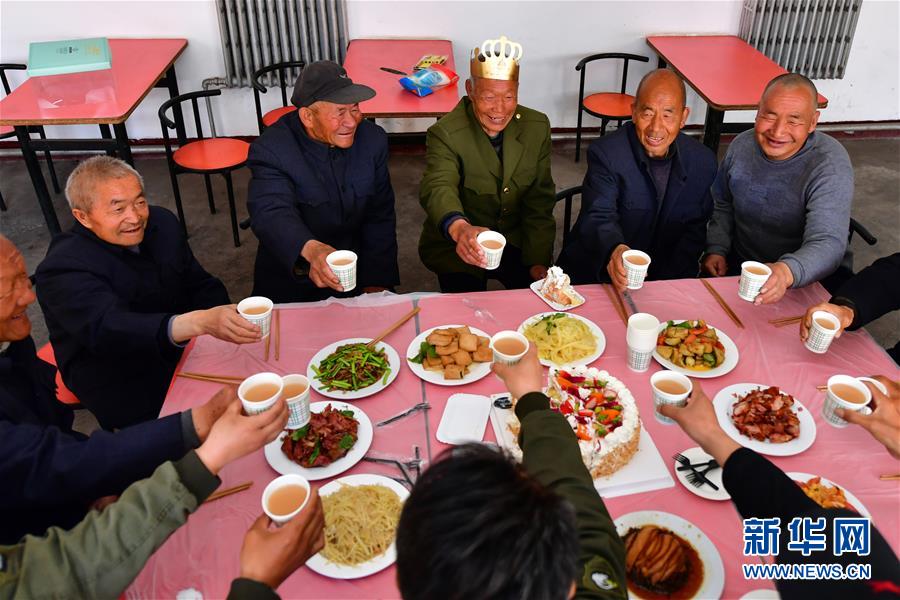 山西省壶关县石坡乡双井村的“五保户”李松兴(右三)在石坡乡养老院过生日(4月22日摄)。新华社记者曹阳摄