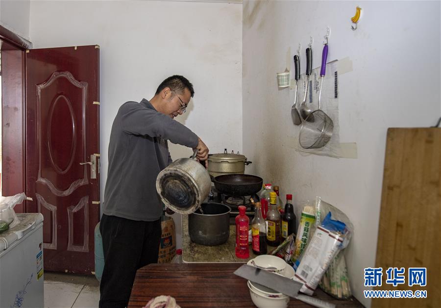 在位于新疆阿克陶县布伦口乡苏巴什村的生活区,天文科技工作者冯国杰在做饭(6月16日摄)。新华社记者胡虎虎摄