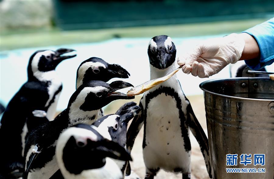 6月26日,漫步归来的企鹅得到美食奖赏。新华社记者 张建松 摄