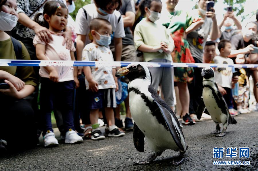 6月26日,上海动物园饲养员引导企鹅在园内漫步。端午小长假第二天,上海动物园开展“企鹅漫步科普行”活动,受到游客欢迎。新华社记者 张建松 摄