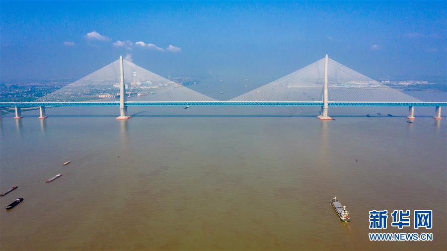 沪苏通长江公铁大桥(6月30日摄,无人机照片)。即将于7月1日通车的沪苏通长江公铁大桥北起江苏南通,南至江苏张家港,公铁合建跨江正桥全长5827米,为集合高速公路、客货混线铁路、高速铁路的“三合一”过江通道,建成通车后将有效促进长三角城市群跨江融合、协同发展。新华社记者李博摄