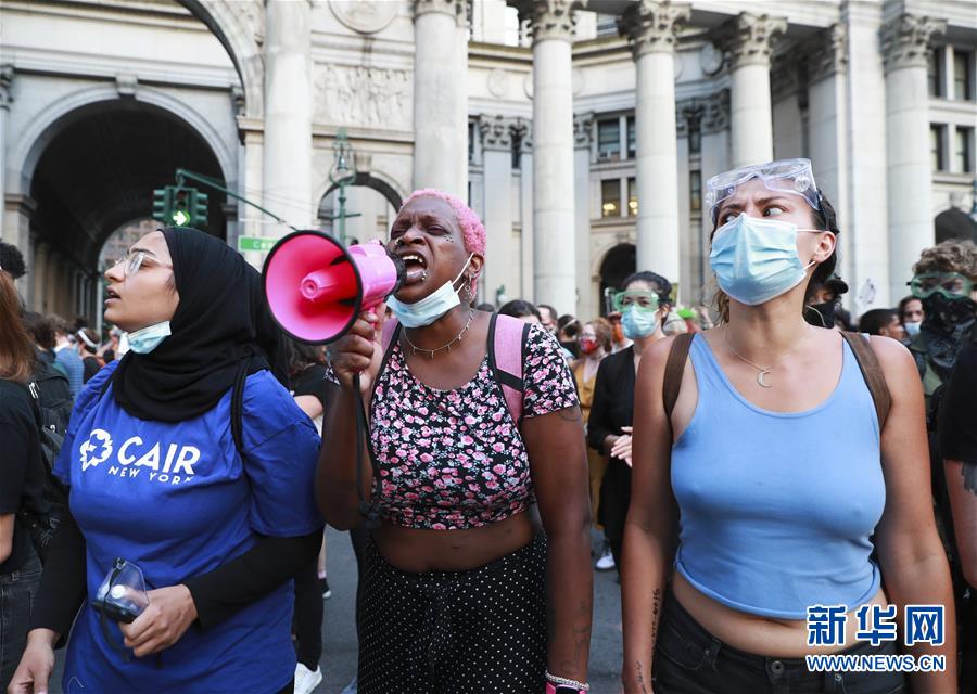 6月30日,人们在美国纽约市政厅附近参加抗议活动。由美国明尼苏达州明尼阿波利斯市非裔男子弗洛伊德遭白人警察暴力执法而死一事引发的各种抗议活动仍在纽约持续进行。新华社记者王迎摄