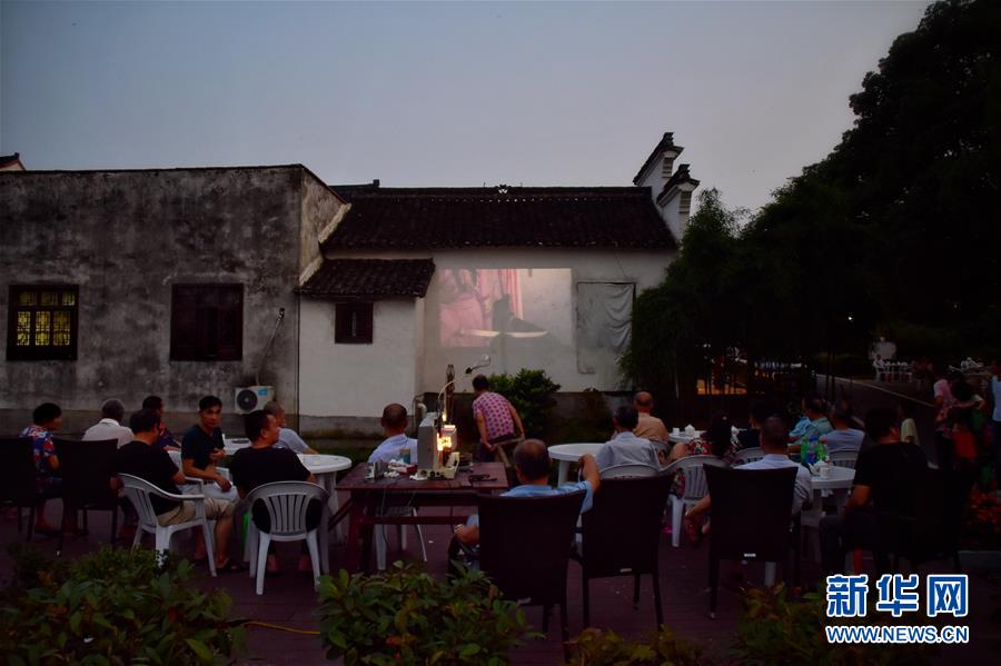 6月30日,天色渐暗,村民自发围坐在广场观看电影。新华社记者郑梦雨摄