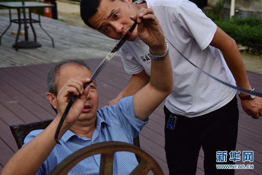 6月30日,朱生荣(左)和儿子朱强(右)在当晚电影开播前检查胶片位置。新华社记者郑梦雨摄