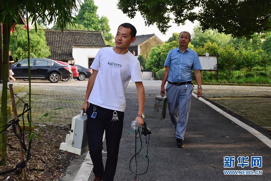 6月30日,朱生荣(右)和儿子朱强(左)携带放映设备来到马鸣村将军湖广场。新华社记者郑梦雨摄