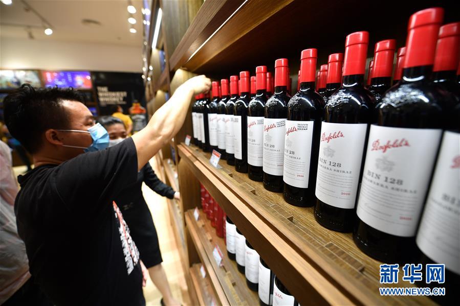 7月1日,顾客在海口日月广场免税店选购酒类商品。当日,海南开始实施调整后的离岛免税购物政策。海南离岛旅客每年每人免税购物额度提高至10万元,电子消费产品等7类新增商品开售。新华社记者郭程摄