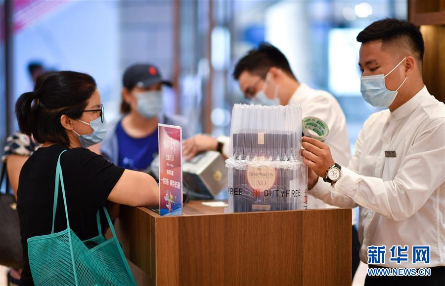 7月1日,海口日月广场免税店的工作人员为顾客打包酒类商品。当日,海南开始实施调整后的离岛免税购物政策。海南离岛旅客每年每人免税购物额度提高至10万元,电子消费产品等7类新增商品开售。新华社记者郭程摄