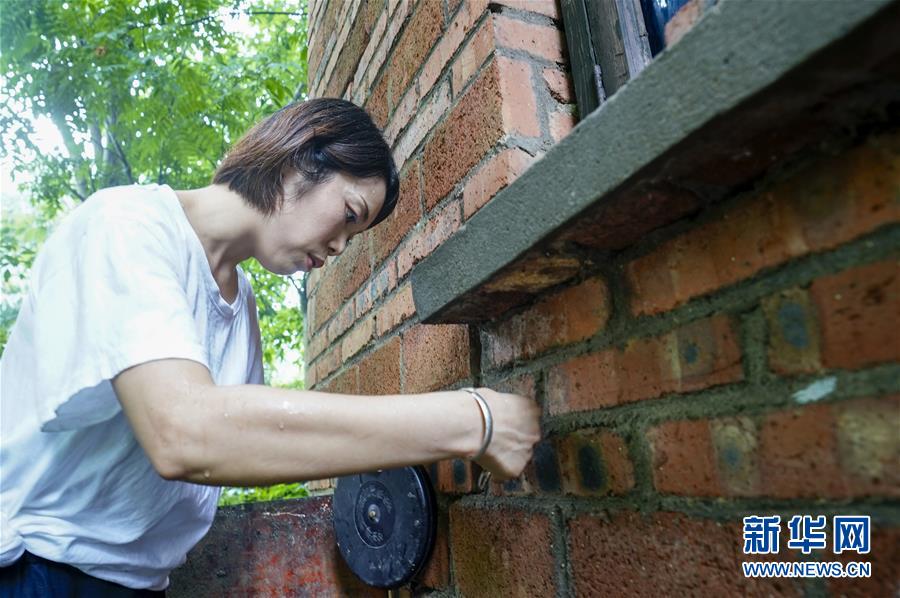 7月1日,地质灾害监测员侯芳对一处农房的墙上裂缝宽度进行测量。新华社记者刘潺摄