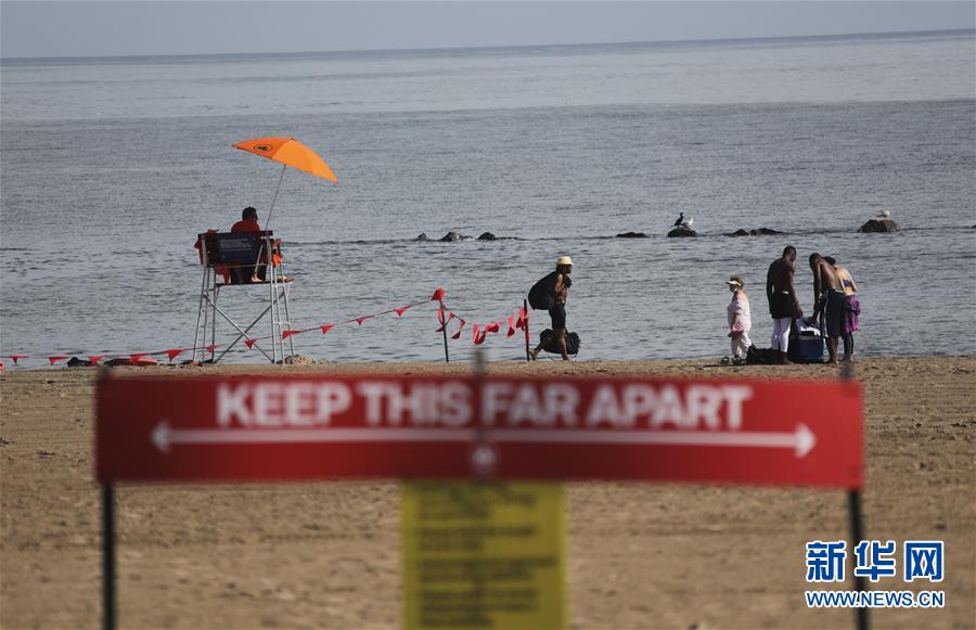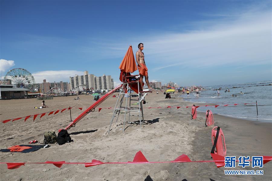 7月1日,救生员在美国纽约科尼岛的一处海滩查看海面情况。当日,美国纽约市属八处海滩正式重新准许民众游泳,救生员也同时上岗。新华社记者王迎摄