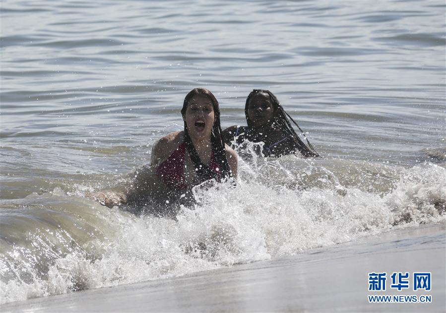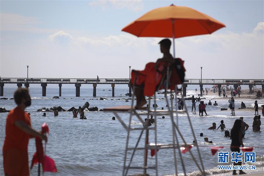 7月1日,人们在美国纽约科尼岛戏水。当日,美国纽约市属八处海滩正式重新准许民众游泳,救生员也同时上岗。新华社记者王迎摄