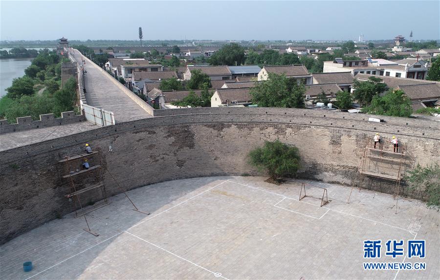 7月2日,工作人员在永年广府古城修缮城墙(无人机照片)。经国家文物局和河北省文物局批准,河北永年广府古城修缮工程已全面启动。在文物专家全程参与下,按照“不改变文物原状”原则进行修缮,预计2021年4月底完工。永年广府古城拥有华北地区保存最完整的古城墙,现为全国重点文物保护单位。新华社记者王晓摄