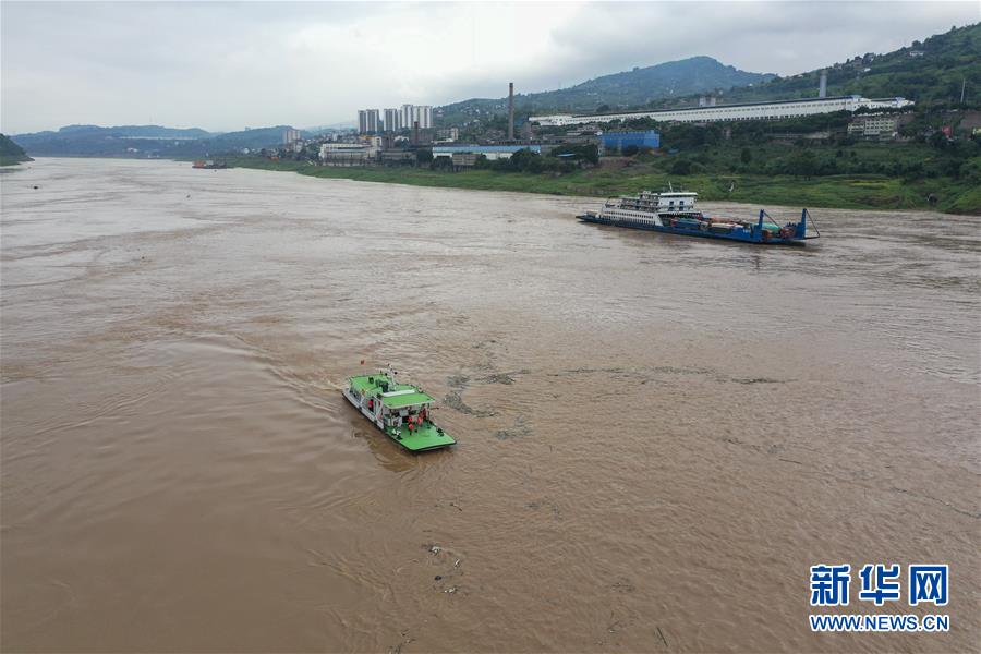 7月2日,长江清溪场水文站的水文作业船(左)在长江上进行水文测量作业(无人机照片)。新华社记者刘潺摄
