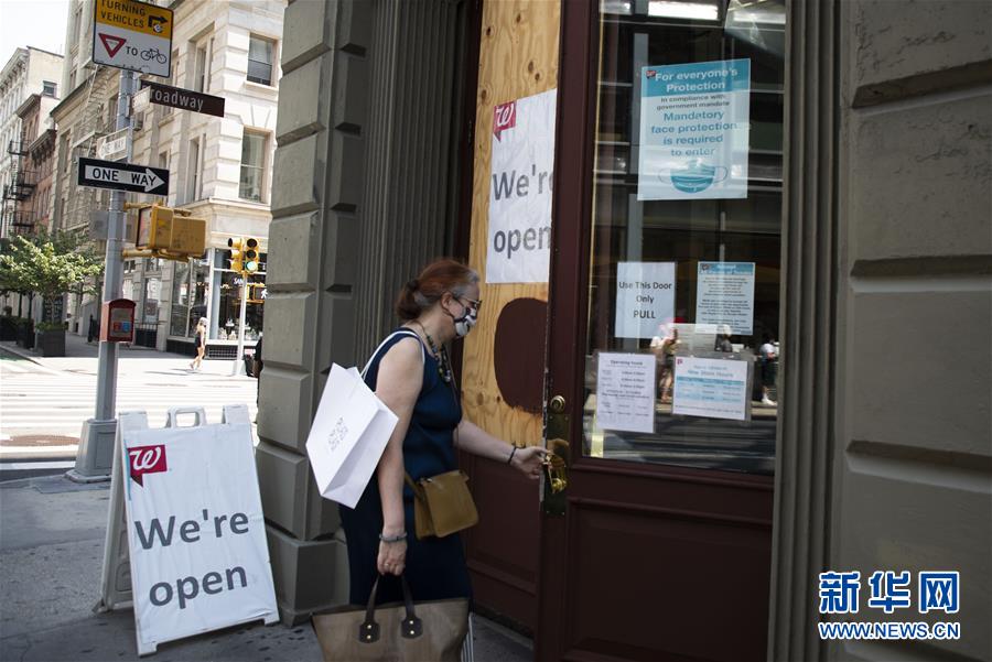 7月6日,佩戴口罩的顾客进入美国纽约的一家超市。新华社记者王迎摄