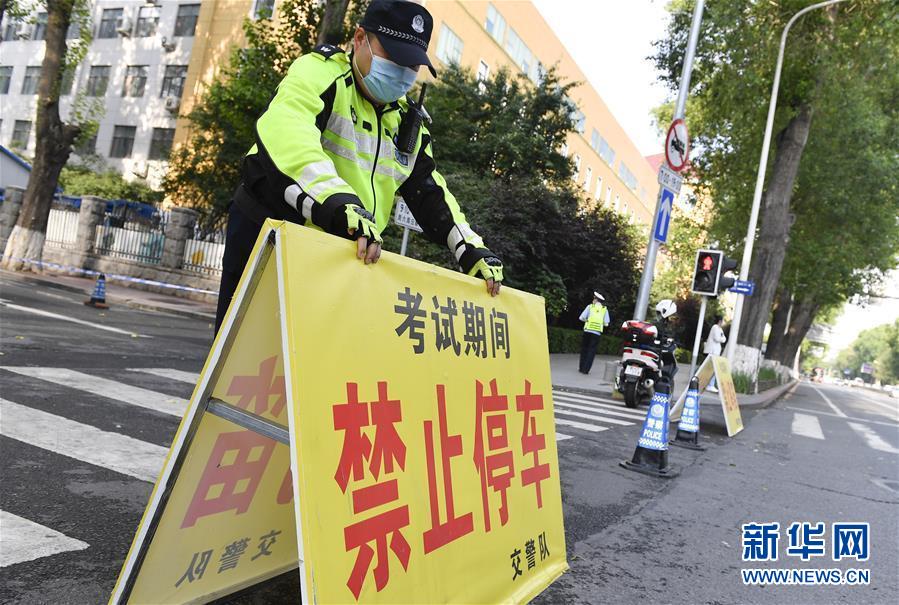 7月7日,在吉林省长春市的东北师范大学附属中学考点外,执勤交警在道路上架设提示牌。当日,2020年高考拉开帷幕。新华社记者许畅摄