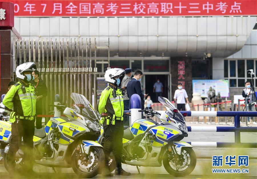7月7日,在乌鲁木齐市第十三中学考点外,乌鲁木齐市公安局交通警察支队特勤大队昆仑铁骑骑警孟凡超(右)与梁剑在执勤。当日,2020年高考拉开帷幕。新华社记者王菲摄