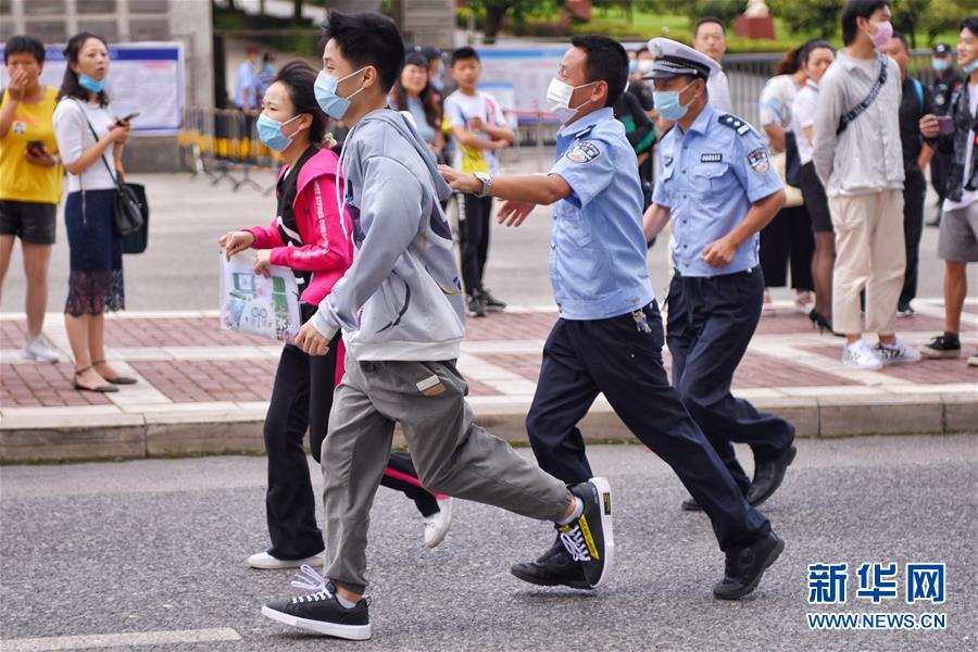 7月7日,在贵州省六盘水市第三中学考点外,两名考生走错考场,警察紧急安排车辆送他们前往正确的考场。当日,2020年高考拉开帷幕。新华社记者刘续摄