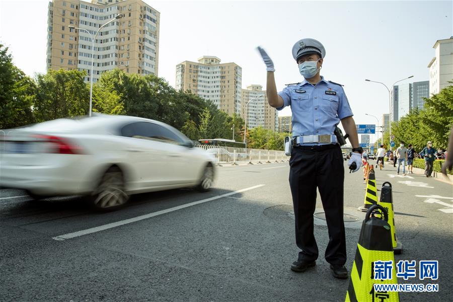 7月7日,在位于北京的中国人民大学附属中学考点外,北京市公安局公安交通管理局海淀交通支队中关村大队交警付云辉在指挥车辆有序行驶。当日,2020年高考拉开帷幕。新华社记者沈伯韩摄