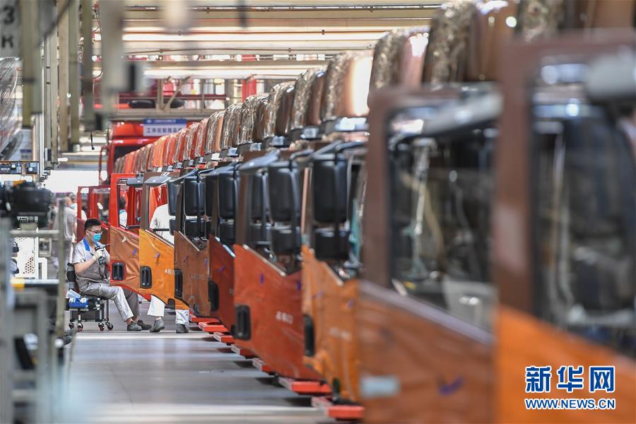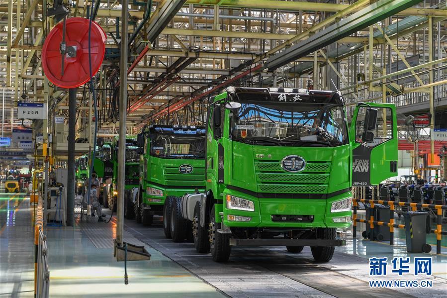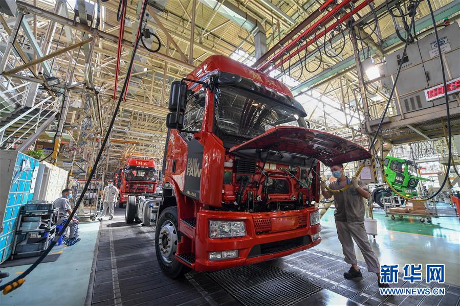 在位于长春市的一汽解放总装车间,工人在装配车辆(6月19日摄)。中国第一汽车集团披露,截至6月30日,集团上半年共计生产整车162.23万辆,同比增长1.5%;销售整车163.09万辆,同比增长2.3%。新华社记者张楠摄