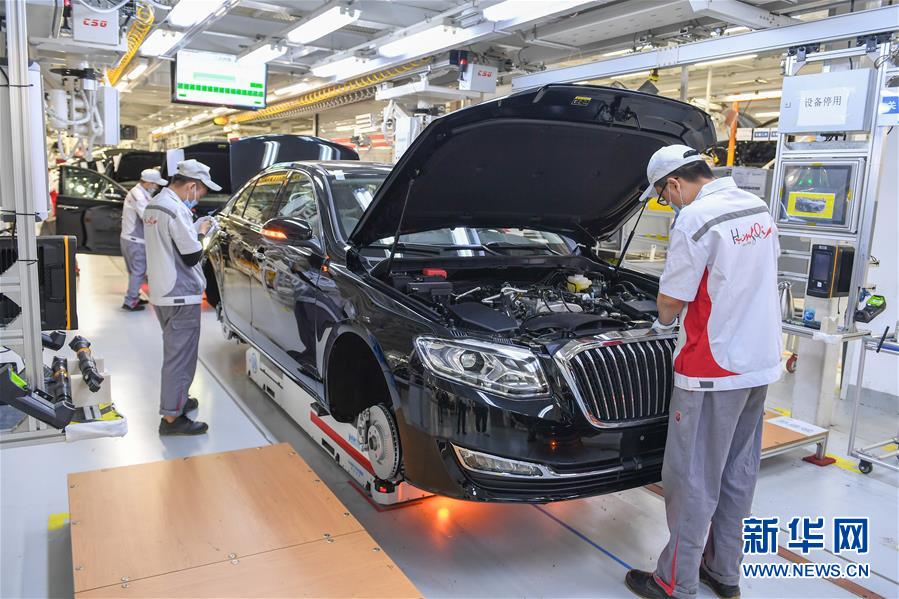 在位于长春市的一汽红旗总装车间,工人在装配车辆(6月19日摄)。中国第一汽车集团披露,截至6月30日,集团上半年共计生产整车162.23万辆,同比增长1.5%;销售整车163.09万辆,同比增长2.3%。新华社记者张楠摄