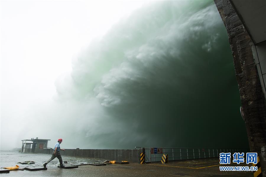 7月7日,新安江电厂工作人员从开启7孔泄洪的新安江水库坝底经过。受持续降水影响,浙江新安江水库水位持续快速上升。继当日10时开启3孔、12时开启5孔泄洪后,新安江水库于16时增加到7孔泄洪。新安江水库是华东地区最大的水库,在钱塘江流域的防洪度汛中起到关键作用。新华社记者翁忻旸摄