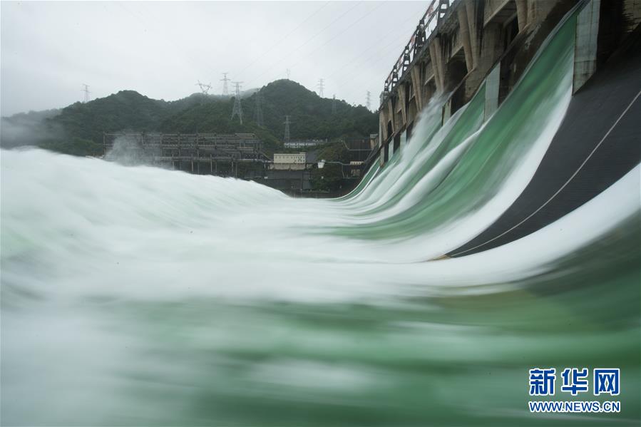 7月7日下午开启7孔泄洪的新安江水库。受持续降水影响,浙江新安江水库水位持续快速上升。继当日10时开启3孔、12时开启5孔泄洪后,新安江水库于16时增加到7孔泄洪。新安江水库是华东地区最大的水库,在钱塘江流域的防洪度汛中起到关键作用。新华社记者翁忻旸摄
