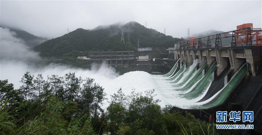 7月7日下午开启7孔泄洪的新安江水库。受持续降水影响,浙江新安江水库水位持续快速上升。继当日10时开启3孔、12时开启5孔泄洪后,新安江水库于16时增加到7孔泄洪。新安江水库是华东地区最大的水库,在钱塘江流域的防洪度汛中起到关键作用。新华社记者翁忻旸摄