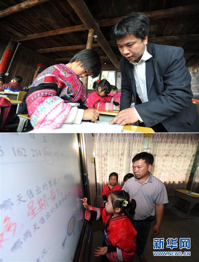 这是一张拼版照片,上图:在广西龙胜龙脊镇江柳村翁江小学,余启贵老师辅导学生做课堂作业(2013年2月26日摄);下图:在广西龙胜龙脊镇江柳村翁江小学,余启贵老师辅导学生做课堂作业(7月7日摄)。新华社记者陆波岸摄