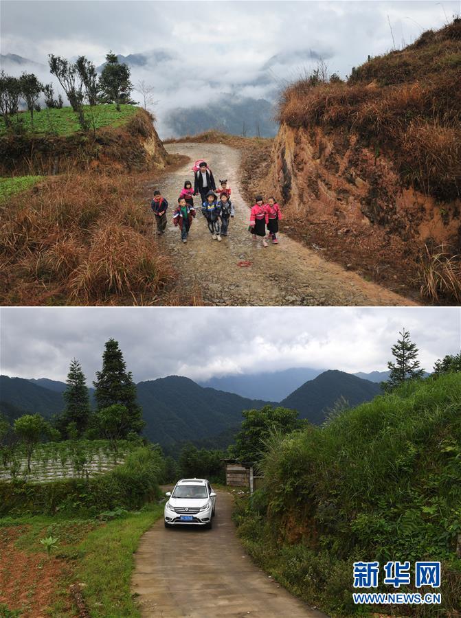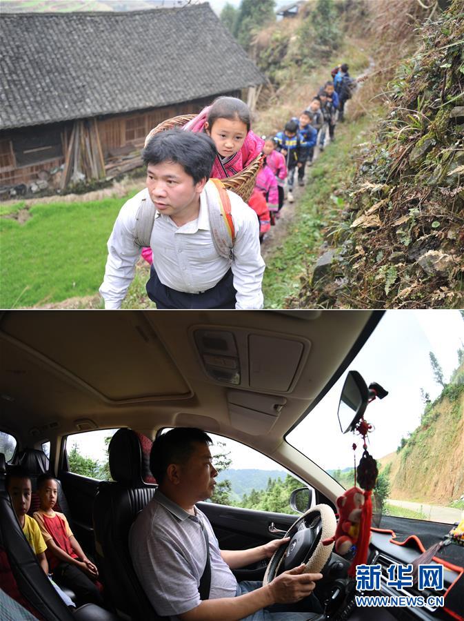 这是一张拼版照片,上图:在广西龙胜龙脊镇江柳村,余启贵老师背着背篓领着学生去学校(2013年2月26日摄);下图:在广西龙胜龙脊镇江柳村,余启贵老师开着自己的汽车带着学生去学校(7月7日摄)。新华社记者陆波岸摄