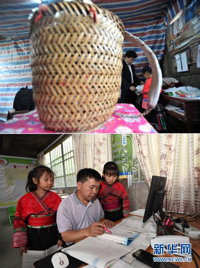 这是一张拼版照片,上图:在广西龙胜龙脊镇江柳村翁江小学,余启贵老师在课间辅导学生功课(2013年2月26日摄);下图:在广西龙胜龙脊镇江柳村翁江小学,余启贵老师在课间辅导学生功课(7月7日摄)。新华社记者陆波岸摄
