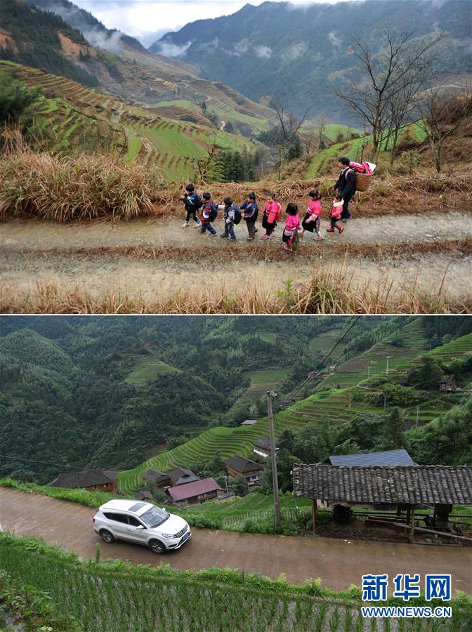 这是一张拼版照片,上图:在广西龙胜龙脊镇江柳村,余启贵老师背着背篓领着学生去学校(2013年2月26日摄);下图:在广西龙胜龙脊镇江柳村,余启贵老师开着自己的汽车带着学生去学校(7月7日摄)。新华社记者陆波岸摄