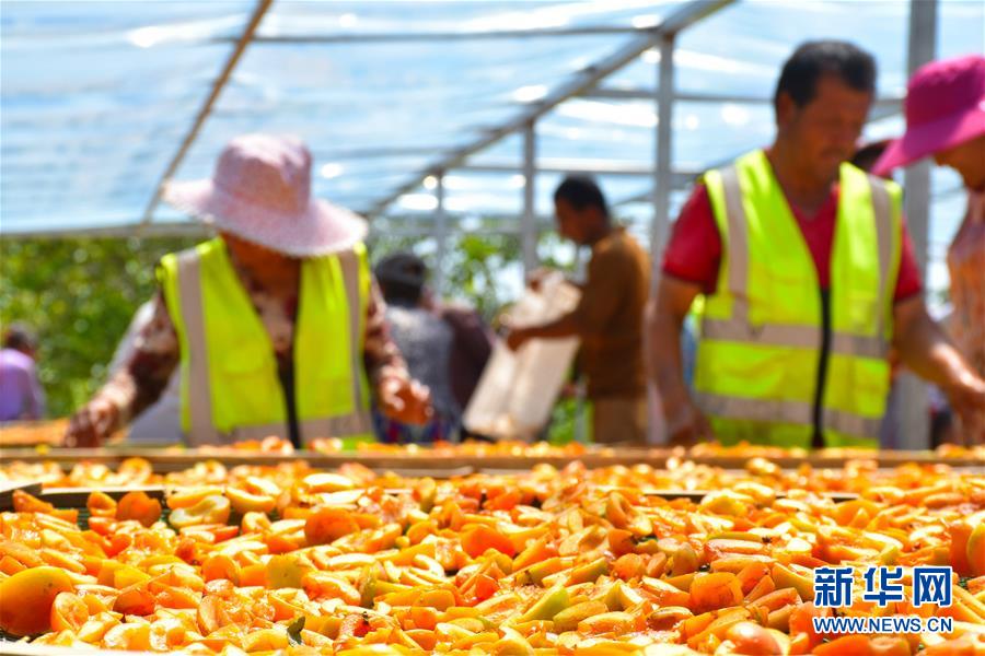 在新疆英吉沙县一家合作社内,员工将去核的杏子推往晒杏棚(7月2日摄)。新华社记者高晗摄