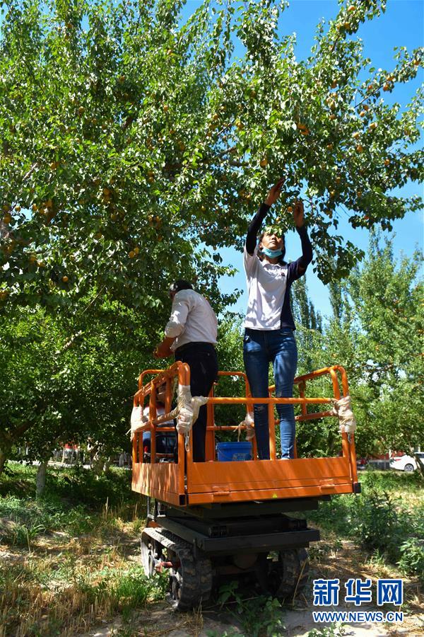 在新疆英吉沙县龙甫乡的杏园,村民吾尼其·肉孜在采摘杏子(7月2日摄)。新华社记者高晗摄