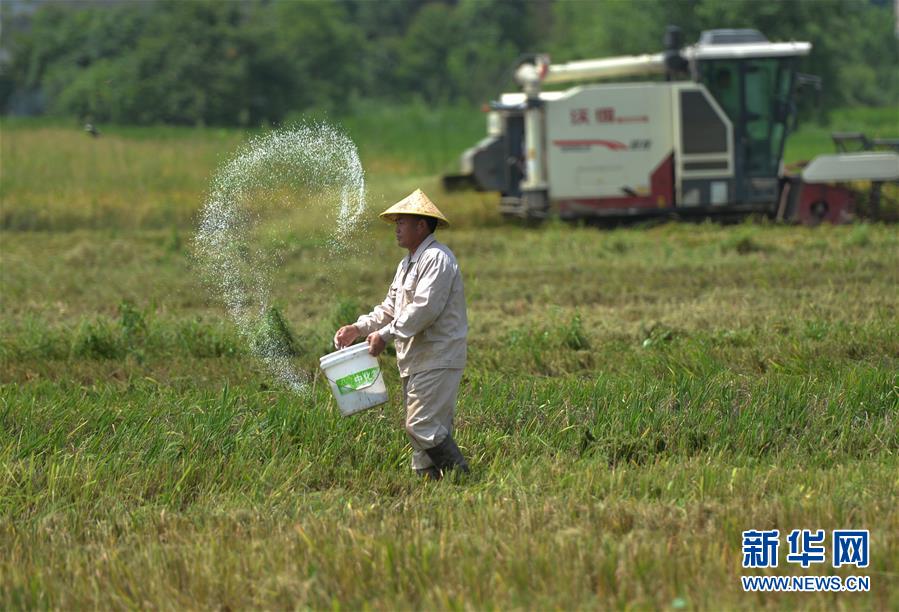 7月11日,村民在湖南省衡阳市衡阳县台源镇台九村收割后的稻田施肥,为种植晚稻做准备。近日,湖南各地农村陆续进入“双抢”季,农民紧抓农时,抢收抢种,力争粮食稳产丰收。新华社记者赵众志摄