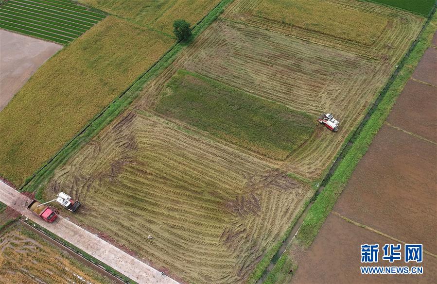 7月11日,在湖南省衡阳市衡阳县台源镇台九村,村民驾驶收割机收割早稻(无人机照片)。近日,湖南各地农村陆续进入“双抢”季,农民紧抓农时,抢收抢种,力争粮食稳产丰收。新华社记者赵众志摄