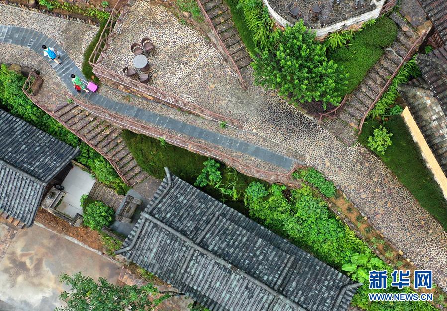 7月11日,游客行走在金秀瑶族自治县六巷乡一处民宿内(无人机照片)。近年来,广西金秀瑶族自治县依托当地自然生态优势,围绕境内丰富的瑶族文化,大力发展乡村旅游,精心打造一批独具瑶族特色的山间民宿酒店,取得良好经济效益。新华社记者 周华 摄