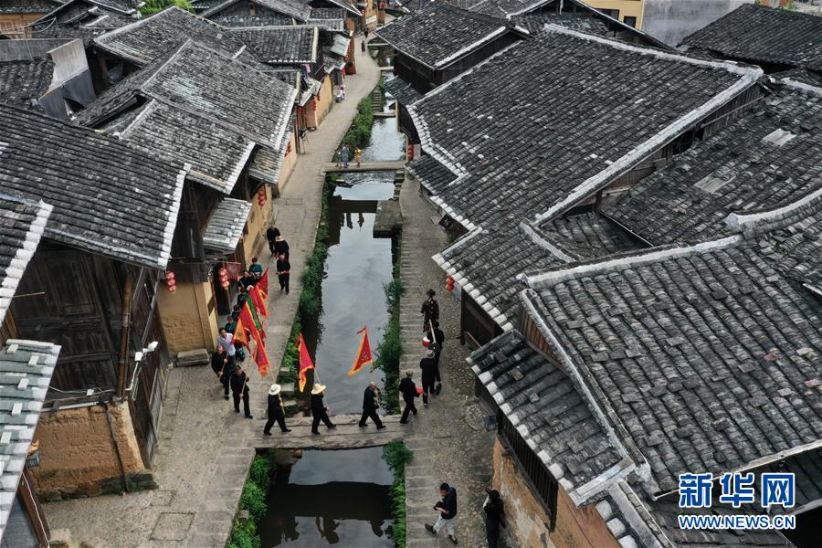 7月4日,浦源村民展示鱼祭习俗(无人机照片)。鱼祭习俗是为死去的鲤鱼举行送葬仪式,是浦源村特有的习俗。新华社记者 姜克红 摄