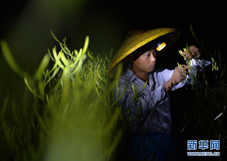 7月12日凌晨,祁东县官家嘴镇草源冲村,一名菜农戴着头灯采摘黄花菜。