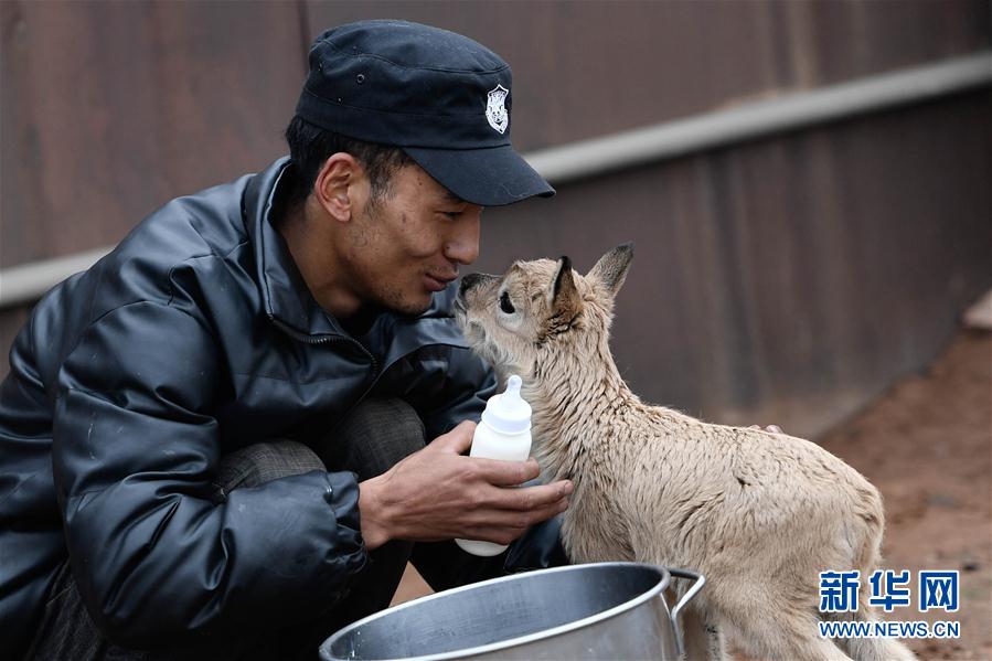 7月7日,三江源国家公园管理局长江源园区可可西里管理处卓乃湖保护站的工作人员才文多杰在给藏羚羊幼仔喂奶。