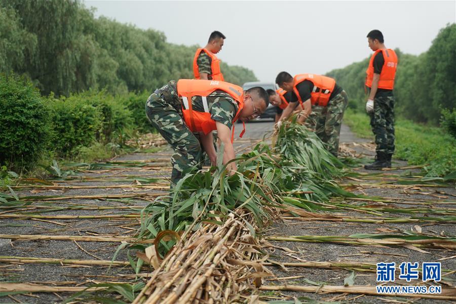 在镇江市丹徒区世业镇先锋村西南大堤,中国安能集团第二工程局常州分公司防汛前置备勤队员准备将捆好的芦苇放在江堤边(7月17日摄)。捆芦苇护边坡、机器人进涵洞、“养水盆”防渗漏……在江苏镇江,当地干部群众和专业力量,因地制宜就地取材,老办法搭配新技术,一批险情得以消除在萌芽状态。新华社记者季春鹏摄