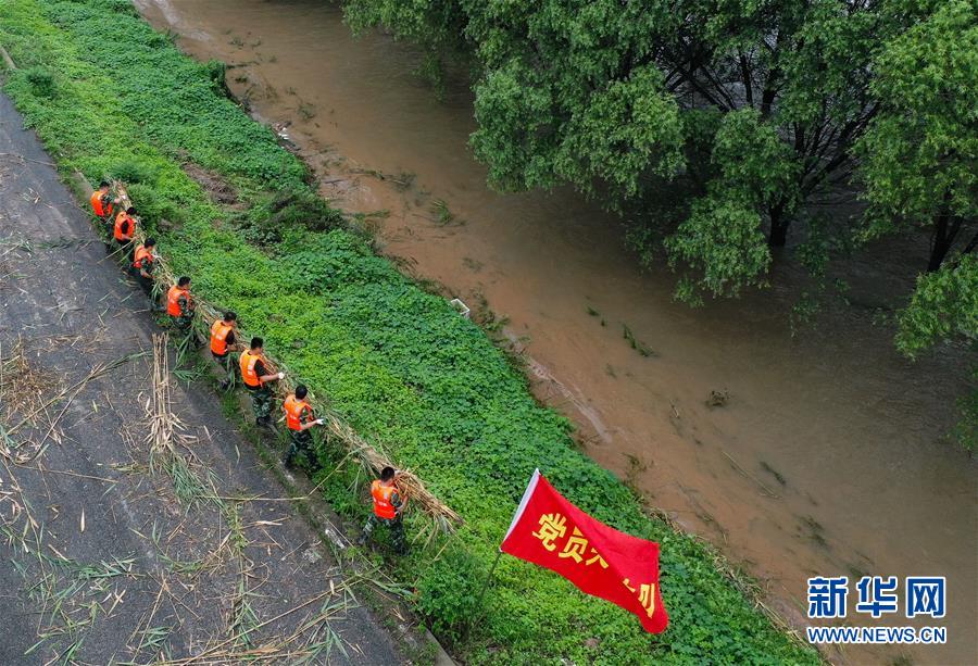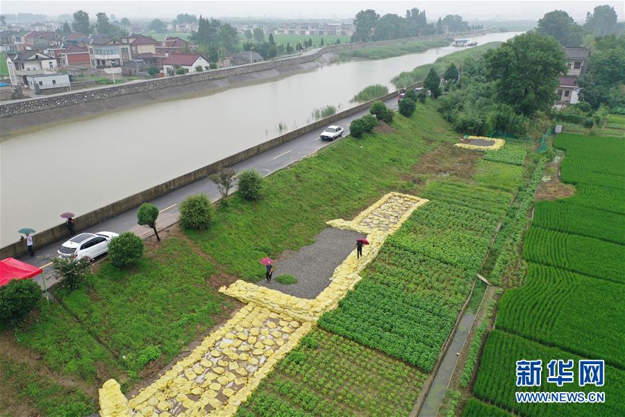 在镇江市丹徒区世业镇先锋村西南大堤,中国安能集团第二工程局常州分公司防汛前置备勤队员在用木桩固定捆好的芦苇(7月17日摄,无人机照片)。捆芦苇护边坡、机器人进涵洞、“养水盆”防渗漏……在江苏镇江,当地干部群众和专业力量,因地制宜就地取材,老办法搭配新技术,一批险情得以消除在萌芽状态。新华社记者季春鹏摄