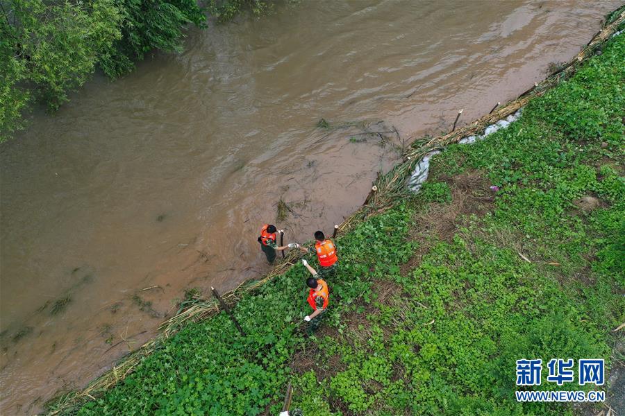 在镇江市丹徒区世业镇先锋村西南大堤,中国安能集团第二工程局常州分公司防汛前置备勤队员在用木桩固定捆好的芦苇(7月17日摄,无人机照片)。捆芦苇护边坡、机器人进涵洞、“养水盆”防渗漏……在江苏镇江,当地干部群众和专业力量,因地制宜就地取材,老办法搭配新技术,一批险情得以消除在萌芽状态。新华社记者季春鹏摄