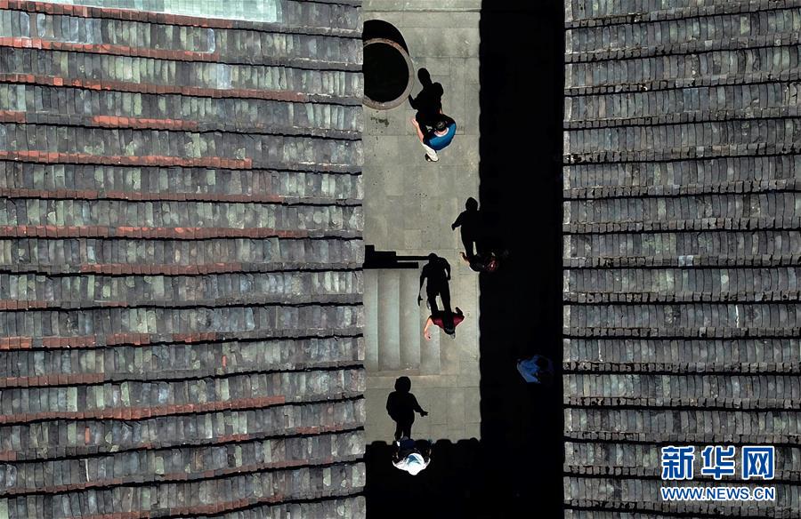 7月19日,游客们在永泰县同安镇爱荆庄里观赏游玩(无人机照片)。近年来,福建省福州市永泰县重视古庄寨保护与利用工作,遵循“保护为主、修旧如旧”原则,加大修缮保护力度,通过对古庄寨古村落等物质载体进行活化利用,打造庄寨+旅游、庄寨+研学等产业发展模式,带动乡村振兴。永泰县地处福州西南部,拥有保存较好的古庄寨152座,面积1000平方米以上、年代100年以上98座。新华社记者魏培全摄