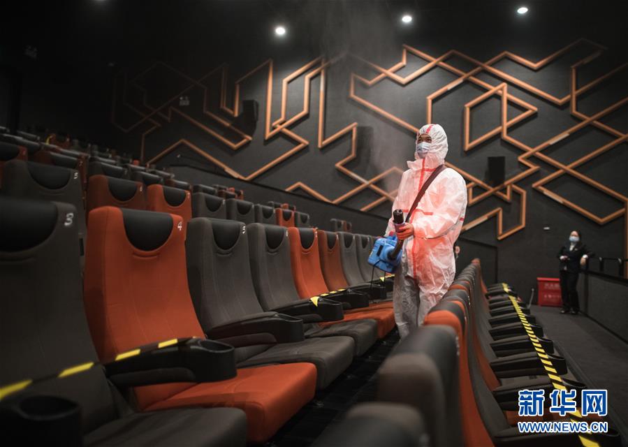 7月20日,武汉一家影院工作人员开展消杀作业。当日,在各项疫情防控措施有效落实到位的前提下,武汉市部分电影院恢复开放。新华社记者肖艺九摄