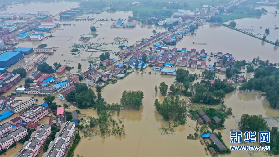 这是7月20日拍摄的六安市裕安区固镇镇被淹的街道(无人机照片)。近日,安徽省六安市裕安区固镇镇遭受严重洪涝灾害,多个村庄被淹,道路中断。目前,多支救援力量在现场转移受灾群众。新华社记者汤阳摄