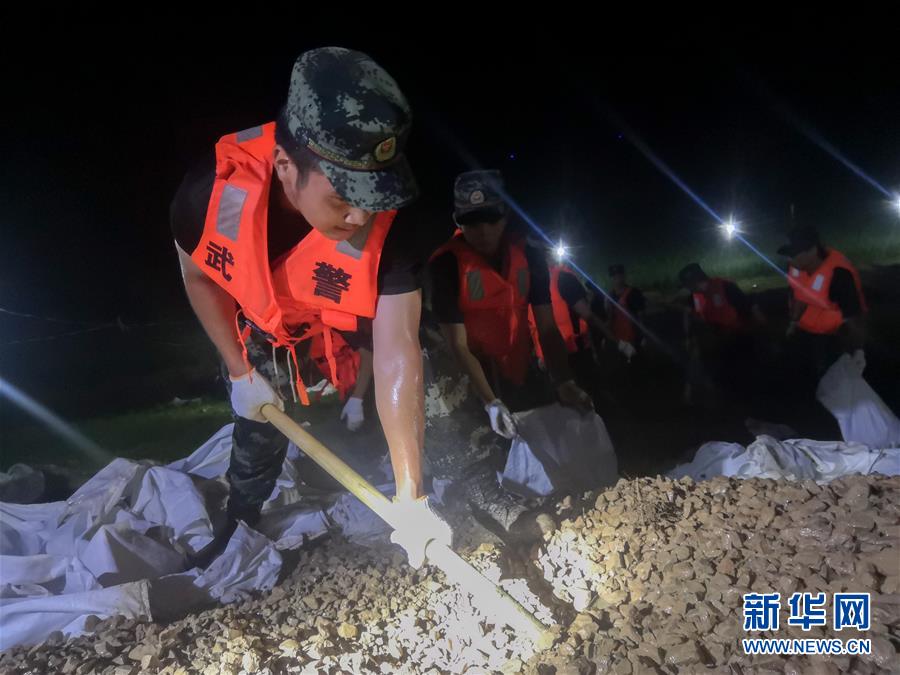 7月20日,在永固垸西线防洪大堤,武警湖南总队岳阳支队官兵处置渗漏险情。新华社发(寻树文摄)
